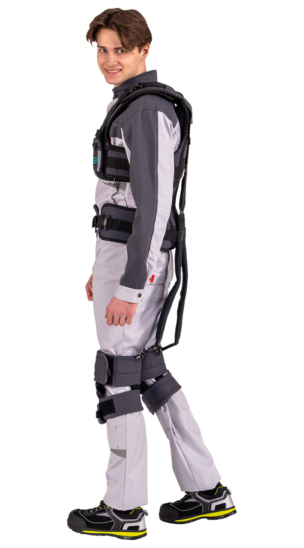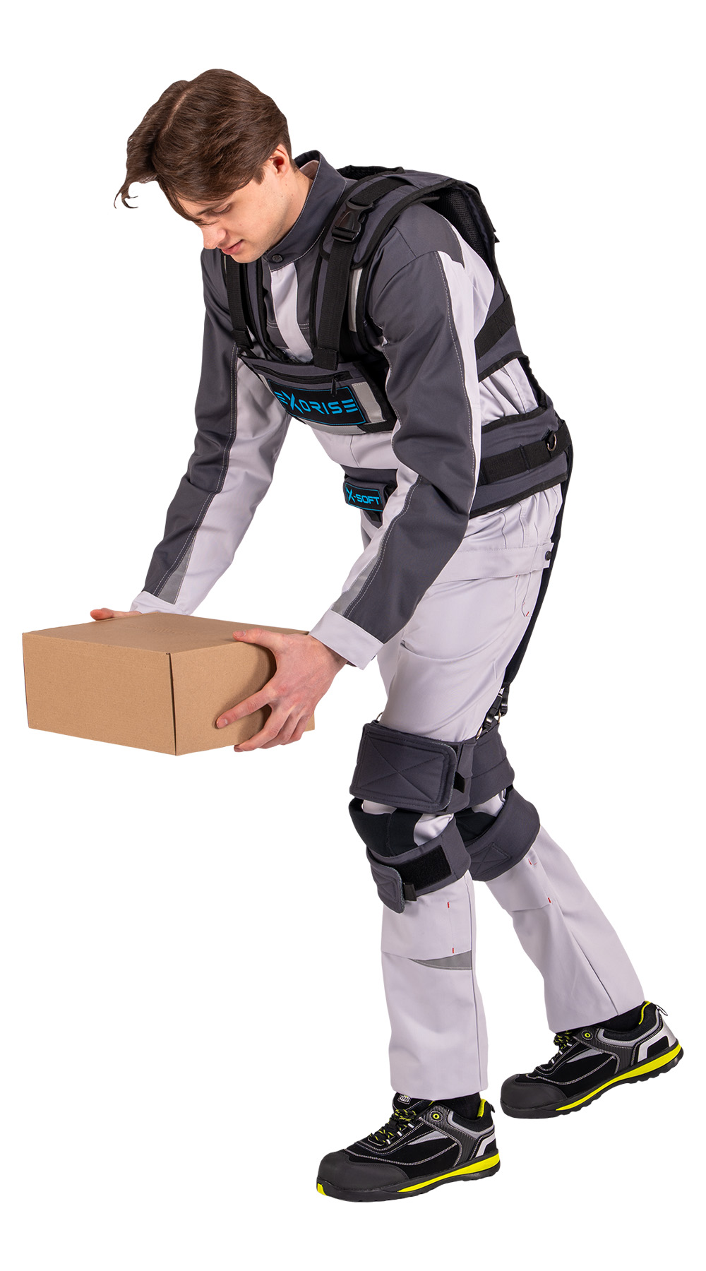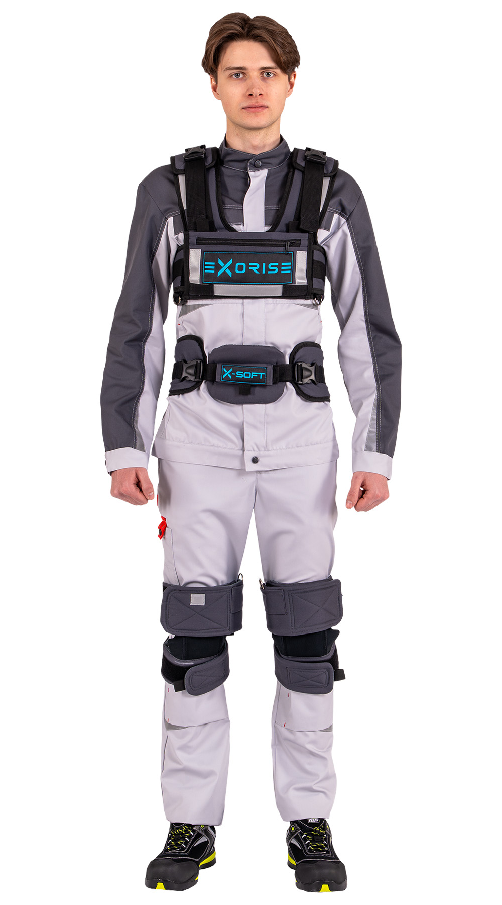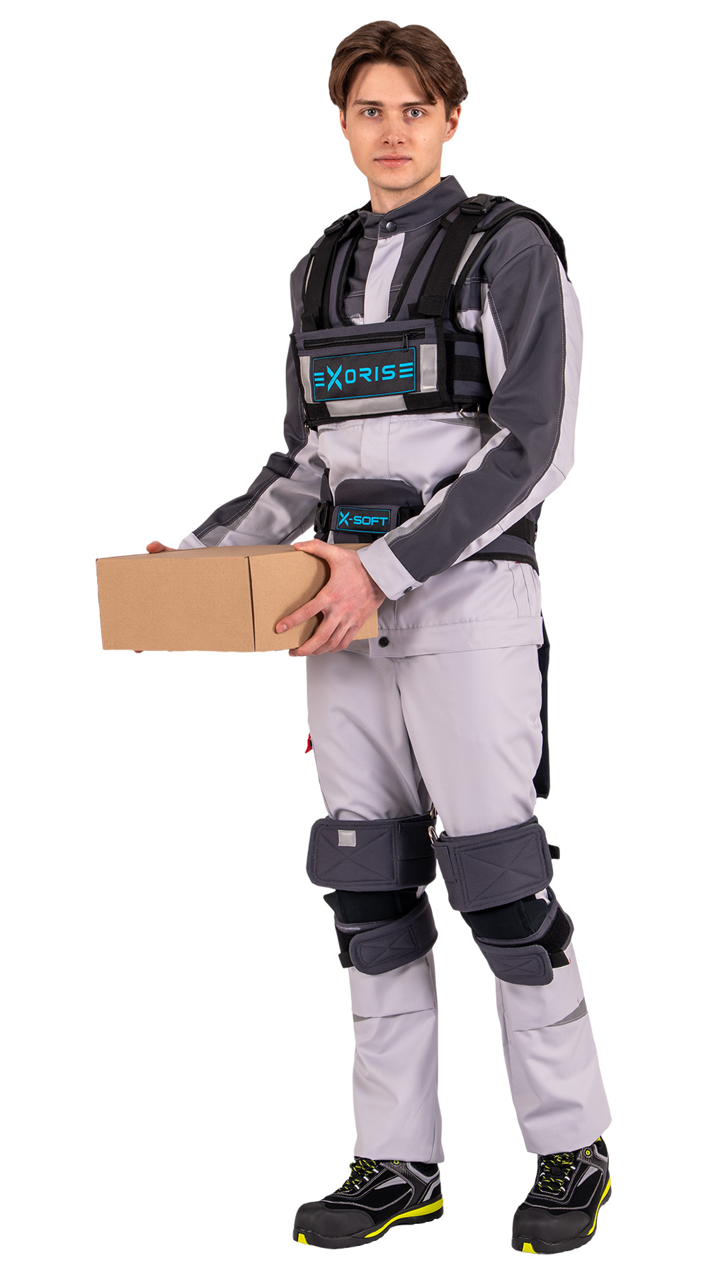 Пассивный промышленный экзоскелет Exorise X-Soft cнижает нагрузку на спину работника при поднятии и переноске грузов, повышает эффективность труда за счёт снижения утомляемости, содействует правильности выполнения работ и защищает работника от травм.