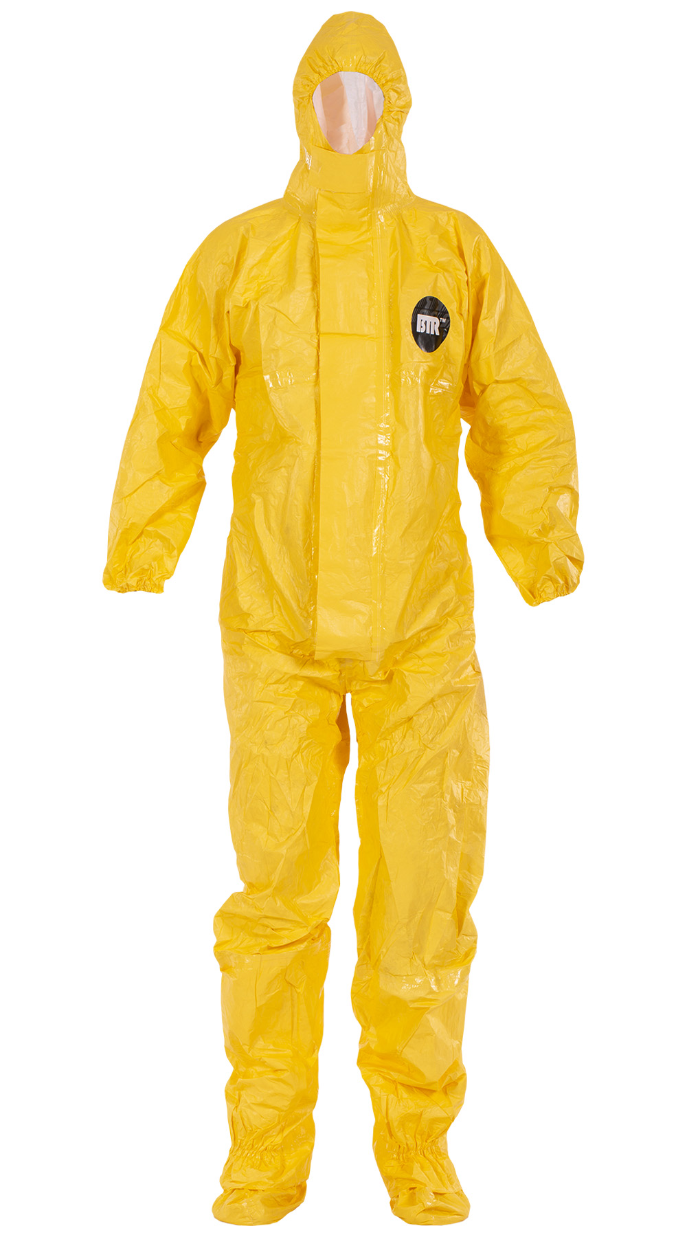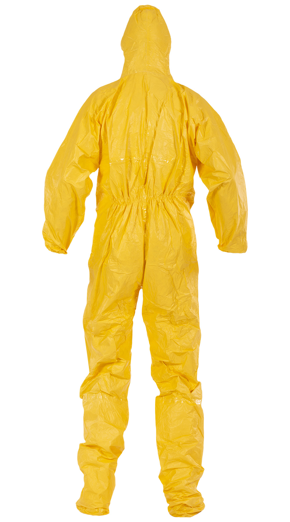 Защитный комбинезон желтого цвета с капюшоном и носками-бахилами, с герметизацией швов термо-лентой прозрачного цвета, без ластовицы, с петлёйна манжетах.