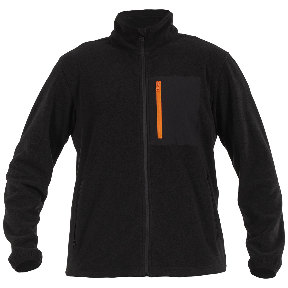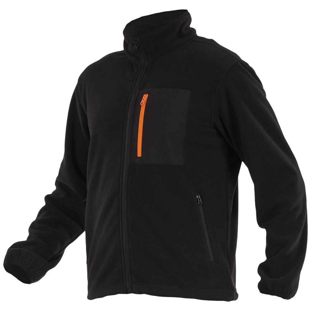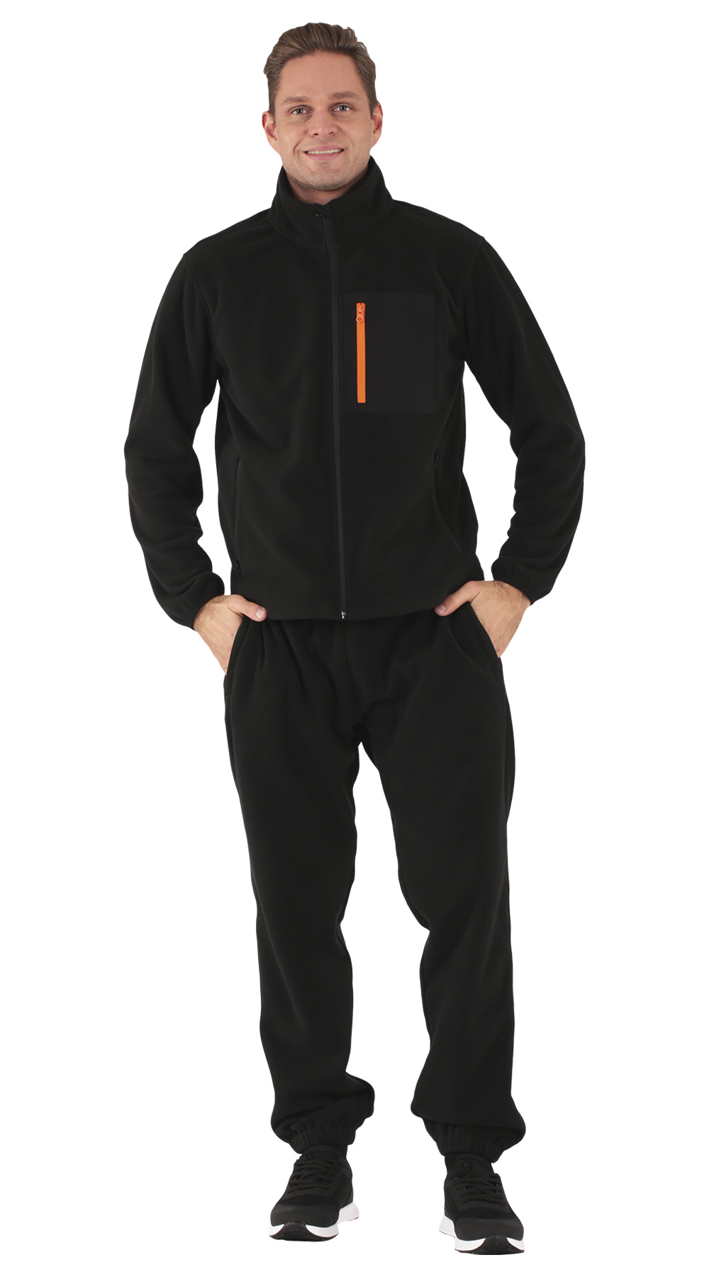 Черная куртка ЭМЕРТОН ФЛИС с стильными оранжевыми элементами гарантирует тепло и комфорт благодаря плотному флису. Идеальна для работы и повседневной носки.
